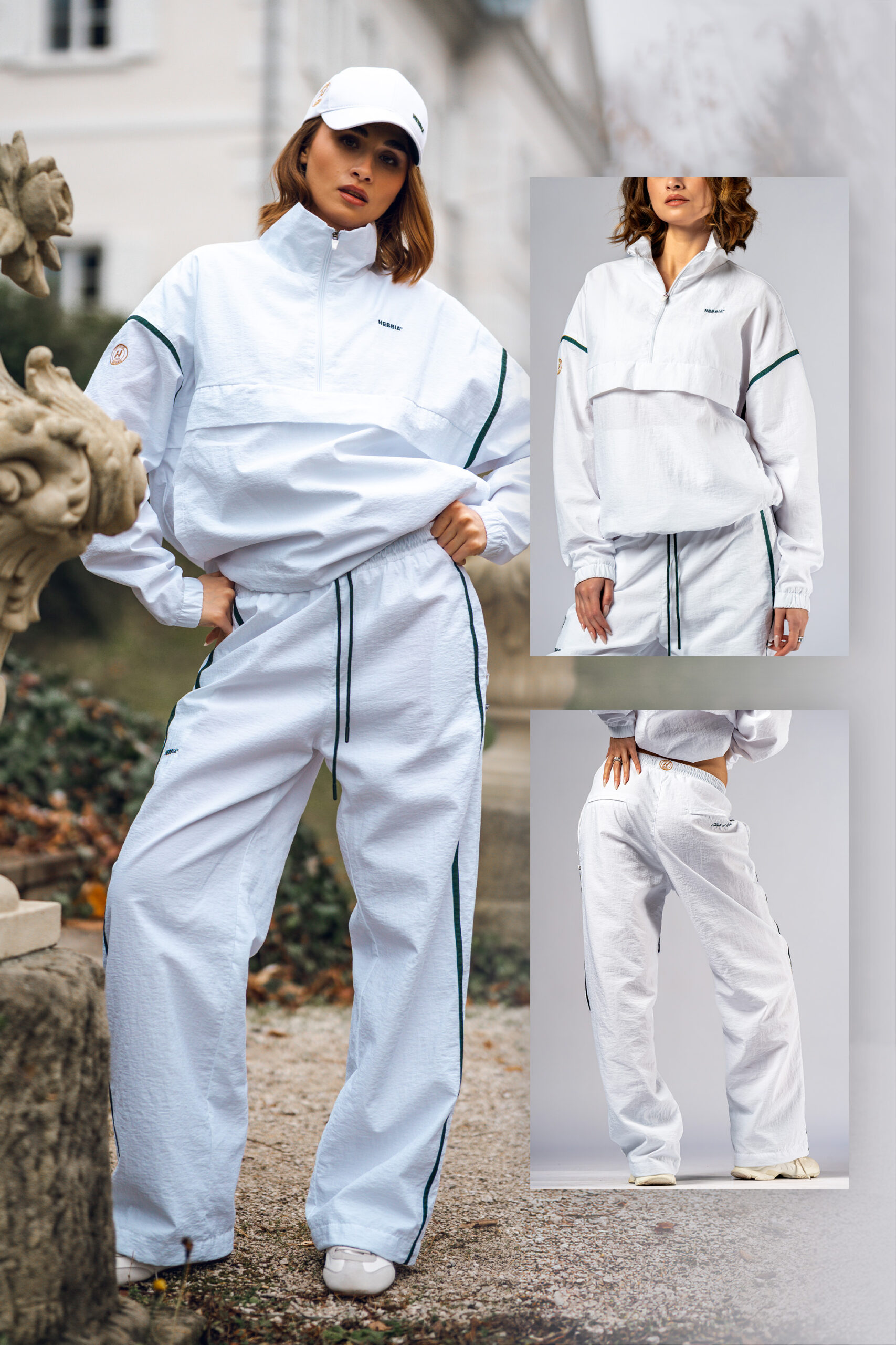 Ľahké a nezameniteľné “parachute” nohavice. Kultový dizajn v prémiovom Royal White prevedení pre sebavedomé športovkyne, ktoré majú svoj jedinečný štýl. Prepracované detaily, tmavozelená a zlatá výšivka pre high-class look. A sťahovanie v páse aj pri členkoch, aby si si upravila fit podľa svojej estetiky.